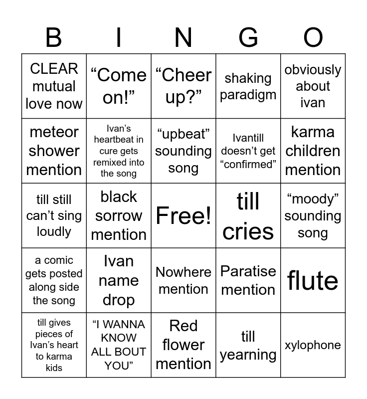 This bingo card has a free space and 24 words: Ivan name drop, “I WANNA KNOW ALL BOUT YOU”, “upbeat” sounding song, till gives pieces of Ivan’s heart to karma kids, obviously about ivan, CLEAR mutual love now, meteor shower mention, “Come on!”, till cries, Nowhere mention, Ivantill doesn’t get “confirmed”, till still can’t sing loudly, Paratise mention, flute, Ivan’s heartbeat in cure gets remixed into the song, till yearning, “moody” sounding song, “Cheer up?”, karma children mention, black sorrow mention, xylophone, a comic gets posted along side the song, shaking paradigm and Red flower mention.
