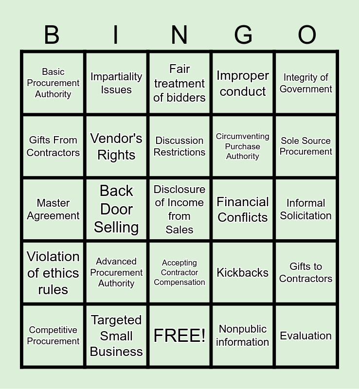 This bingo card has 29 words: Competitive Procurement, Conflict of Interest, Back Door Selling, Evaluation, Basic Procurement Authority, Fair treatment of bidders, Vendor's Rights, Advanced Procurement Authority, Financial Conflicts, Targeted Small Business, Informal Solicitation, Disclosure of Income from Sales, FREE!, Nonpublic information, Sole Source Procurement, Requisition, Accepting Contractor Compensation, Violation of ethics rules, Integrity of Government, Master Agreement, Kickbacks, Emergency Procurement, Circumventing Purchase Authority, Gifts From Contractors, Improper conduct, Impartiality Issues, Gifts to Contractors, Discussion Restrictions and Working for a Contractor after GOV..