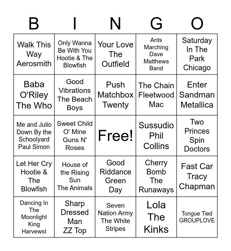 This bingo card has a free space and 65 words: 3AM Matchbox Twenty, Ain't No Rest For The Wicked Cage The Elephants, Say It Ain't So Weezer, Fast Car Tracy Chapman, Free Bird Lynyrd Skynyrd, Santeria Sublime, Only Wanna Be With You Hootie & The Blowfish, Accidentally In Love Counting Crows, Push Matchbox Twenty, Don't Look Back In Anger Oasis, Good Riddance Green Day, Go Your Own Way Fleetwood Mac, Two Princes Spin Doctors, Saturday In The Park Chicago, Bennie And The Jets Elton John, Baba O'Riley The Who, Sweet Child O' Mine Guns N' Roses, Walk This Way Aerosmith, It's The End Of The World R. E. M., The Chain Fleetwood Mac, House of the Rising Sun The Animals, Let Her Cry Hootie & The Blowfish, Ants Marching Dave Matthews Band, Slide The Goo Goo Dolls, Semi-Charmed Life Third Eye Blind, Jumper Third Eye Blind, I'm a Believer The Monkees, Rockstar Nickelback, Tongue Tied GROUPLOVE, London Calling The Clash, Dancing In The Moonlight King Harvewst, Hooked On A Feeling Blue Swede, Bjorn Skifs, Jungle Boogie Kool & The Gang, Sultans of Swing Dire Straits, Cherry Bomb The Runaways, Sharp Dressed Man ZZ Top, My Best Friend's Girl The Cars, Me and Julio Down By the Schoolyard Paul Simon, Lola The Kinks, You Can Call Me Al Paul Simon, Good Vibrations The Beach Boys, Private Eyes Daryl Hall & John Oats, Sussudio Phil Collins, The Heart Of Rock and Roll Huey Lewis & The News, If This Is It Huey Lewis & The News, Three Little Birds Bob Marley& The Wailers, Enter Sandman Metallica, I Fought The Law The Clash, Kokomo The Beach Boys, Are You Gonna Go My Way Lenny Kravitz, Mamma, Don't Let Your Babies Grow Up ... Waylon Jennings/Willie Nelson, Blitzkrieg Bop Ramones, Rehab Amy Winehouse, Seven Nation Army The White Stripes, Fell In Love With a Girl The White Stripes, Dead Leaves and the Dirty ... The White Stripes, MMMBop Hanson, Your Love The Outfield, When I Come Around Green Day, Chelsea Dagger The Fratellis, Fly Like An Eagle Steve Miller Band, Stressed Out Twenty One Pilots, Car Radio Twenty One Pilots, Steady, As She Goes The Raconteurs and Lonely Boy The Black Boys.