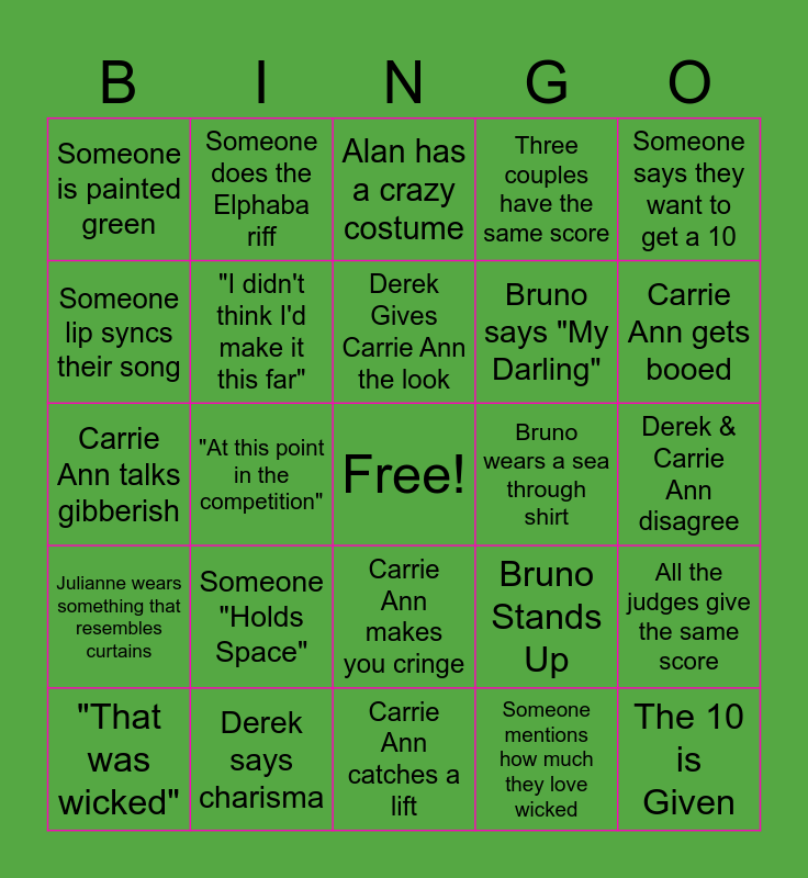 This bingo card has a free space and 24 words: "That was wicked", Someone "Holds Space", Derek Gives Carrie Ann the look, Someone mentions how much they love wicked, Someone says they want to get a 10, Someone is painted green, Someone does the Elphaba riff, Alan has a crazy costume, Bruno wears a sea through shirt, Derek & Carrie Ann disagree, Carrie Ann talks gibberish, "I didn't think I'd make it this far", Bruno Stands Up, All the judges give the same score, Someone lip syncs their song, Derek says charisma, Carrie Ann catches a lift, Three couples have the same score, Carrie Ann gets booed, Julianne wears something that resembles curtains, "At this point in the competition", Carrie Ann makes you cringe, Bruno says "My Darling" and The 10 is Given.