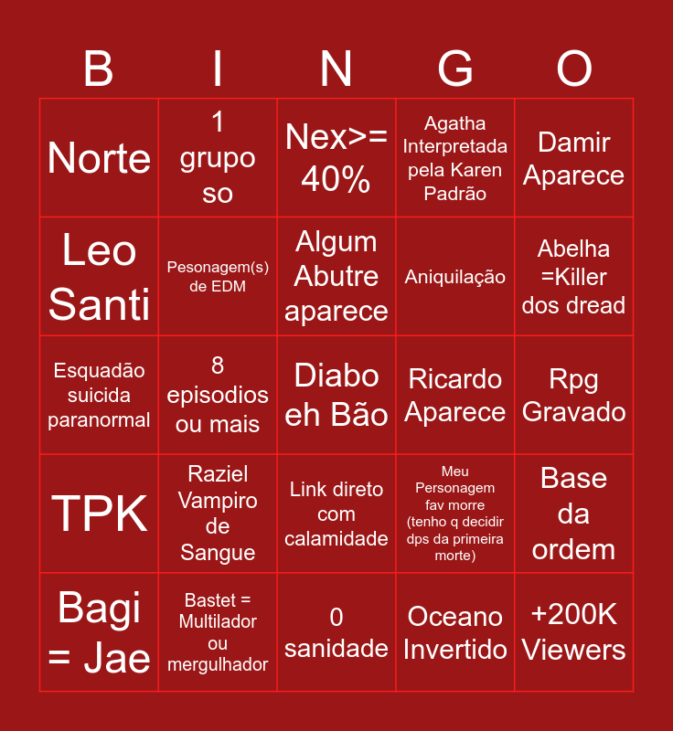 This bingo card has a free space and 24 words: Raziel Vampiro de Sangue, Bastet = Multilador ou mergulhador, Algum Abutre aparece, Bagi = Jae, Damir Aparece, Norte, Leo Santi, 1 grupo so, Ricardo Aparece, Link direto com calamidade, Aniquilação, Esquadão suicida paranormal, Meu Personagem fav morre (tenho q decidir dps da primeira morte), Base da ordem, Pesonagem(s) de EDM, Oceano Invertido, Rpg Gravado, Nex>= 40%, Abelha =Killer dos dread, 8 episodios ou mais, +200K Viewers, TPK, Agatha Interpretada pela Karen Padrão and 0 sanidade.