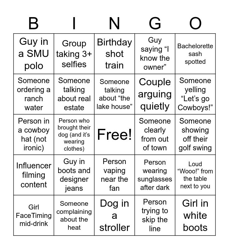 This bingo card has a free space and 25 words: Guy in boots and designer jeans, Dog in a stroller, Someone talking about “the lake house”, Girl FaceTiming mid-drink, Bachelorette sash spotted, Guy in a SMU polo, Someone ordering a ranch water, Group taking 3+ selfies, Someone clearly from out of town, Person vaping near the fan, Couple arguing quietly, Person in a cowboy hat (not ironic), Person wearing sunglasses after dark, Loud “Wooo!” from the table next to you, Someone talking about real estate, Guy named Chad or Kyle (confirmed), Someone showing off their golf swing, Birthday shot train, Someone yelling “Let’s go Cowboys!”, Person who brought their dog (and it’s wearing clothes), Girl in white boots, Someone complaining about the heat, Influencer filming content, Guy saying “I know the owner” and Person trying to skip the line.