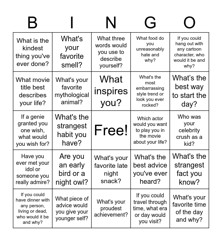This bingo card has a free space and 24 words: Are you an early bird or a night owl?, What piece of advice would you give your younger self?, What inspires you?, If you could have dinner with any person, living or dead, who would it be and why?, If you could hang out with any cartoon character, who would it be and why?, What is the kindest thing you've ever done?, What movie title best describes your life?, What's your favorite smell?, Which actor would you want to play you in the movie about your life?, What's your favorite late night snack?, What's the most embarrassing style trend or look you ever rocked?, If a genie granted you one wish, what would you wish for?, What's the best advice you've ever heard?, What's the strangest fact you know?, What's your favorite mythological animal?, If you could travel through time, what era or day would you visit?, Who was your celebrity crush as a kid?, What three words would you use to describe yourself?, What’s the best way to start the day?, What's the strangest habit you have?, What's your favorite time of the day and why?, Have you ever met your idol or someone you really admire?, What food do you unreasonably hate and why? and What's your proudest achievement?.