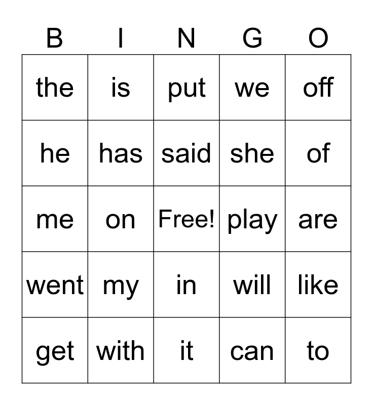 This bingo card has a free space and 33 words: a, am, on, have, went, has, off, get, is, was, said, put, for, no, play, of, with, me, my, will, in, you, the, are, it, to, we, she, he, like, see, can and I.
