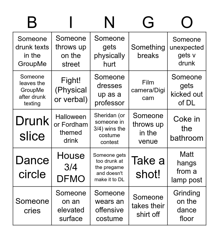 This bingo card has 25 words: House 3/4 DFMO, Someone wears an offensive costume, Someone dresses up as a professor, Someone cries, Someone unexpected gets v drunk, Someone drunk texts in the GroupMe, Someone leaves the GroupMe after drunk texting, Someone throws up on the street, Someone throws up in the venue, Someone gets too drunk at the pregame and doesn't make it to DL, Film camera/Digi cam, Drunk slice, Take a shot!, Matt hangs from a lamp post, Fight! (Physical or verbal), Grinding on the dance floor, Coke in the bathroom, Someone gets physically hurt, Someone gets kicked out of DL, Halloween or Fordham themed drink, Sheridan (or someone in 3/4) wins the costume contest, Someone on an elevated surface, Dance circle, Something breaks and Someone takes their shirt off.