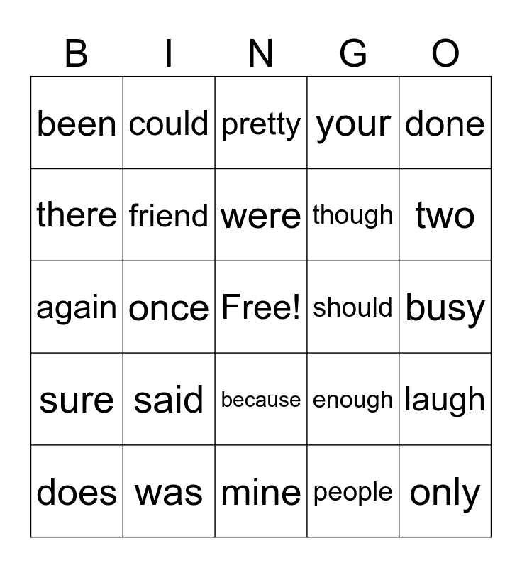 This bingo card has a free space and 24 words: said, was, were, does, done, been, there, could, should, because, though, again, enough, laugh, friend, people, busy, pretty, two, once, only, sure, your and mine.