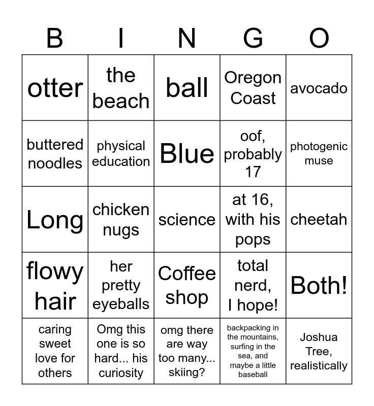 This bingo card has 25 words: her pretty eyeballs, omg there are way too many... skiing?, Blue, caring sweet love for others, avocado, otter, buttered noodles, the beach, at 16, with his pops, Coffee shop, oof, probably 17, Long, total nerd, I hope!, Both!, physical education, Joshua Tree, realistically, cheetah, ball, photogenic muse, chicken nugs, science, Omg this one is so hard... his curiosity, flowy hair, Oregon Coast and backpacking in the mountains, surfing in the sea, and maybe a little baseball.