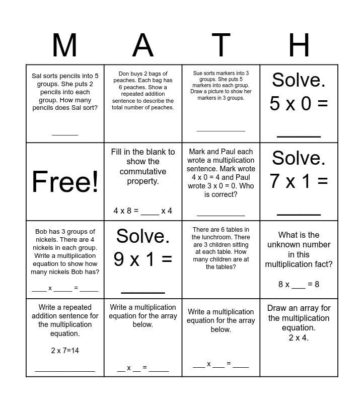 This bingo card has 16 words: Write a multiplication equation for the array below. __ x __ = _____, What is the unknown number in this multiplication fact? 8 x ___ = 8, Sue sorts markers into 3 groups. She puts 5 markers into each group. Draw a picture to show her markers in 3 groups. _________________, Sal sorts pencils into 5 groups. She puts 2 pencils into each group. How many pencils does Sal sort? _______, Bob has 3 groups of nickels. There are 4 nickels in each group. Write a multiplication equation to show how many nickels Bob has? ____ x _____ = _____, Don buys 2 bags of peaches. Each bag has 6 peaches. Show a repeated addition sentence to describe the total number of peaches., There are 6 tables in the lunchroom. There are 3 children sitting at each table. How many children are at the tables?, Write a multiplication equation for the array below. ___ x ___ = ____, Free!, Fill in the blank to show the commutative property. 4 x 8 = ____ x 4, Write a repeated addition sentence for the multiplication equation. 2 x 7=14 _______________, Solve. 5 x 0 = ____, Solve. 9 x 1 = ____, Solve. 7 x 1 = ____, Mark and Paul each wrote a multiplication sentence. Mark wrote 4 x 0 = 4 and Paul wrote 3 x 0 = 0. Who is correct? ____________ and Draw an array for the multiplication equation. 2 x 4..