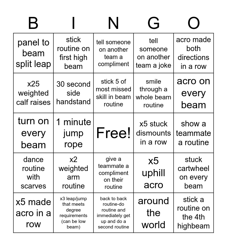 This bingo card has a free space and 29 words: x5 made acro in a row, high five a coach after a great turn, 1 minute jump rope, make 4 routines with a partner, panel to beam split leap, tell someone on another team a compliment, 30 second side handstand, x2 weighted arm routine, x5 stuck dismounts in a row, x3 leap/jump that meets degree requirements (can be low beam), show a teammate a routine, stick a routine on the 4th highbeam, back to back routine-do routine and immediately get up and do a second routine, around the world, acro on every beam, x5 turns no wobbles, give a teammate a compliment on their routine, dance routine with scarves, acro made both directions in a row, turn on every beam, x5 uphill acro, x5 jumps/jump series in a row (no wobbles), smile through a whole beam routine, x25 weighted calf raises, tell someone on another team a joke, stick routine on first high beam, stuck cartwheel on every beam, stick 5 of most missed skill in beam routine and x5 perfect mounts.