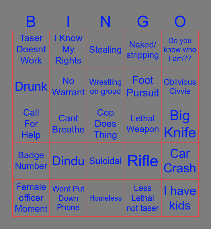 This bingo card has a free space and 53 words: Screaming Woman, I have kids, Florida, Less Lethal not taser, Dindu, Assault, I Know My Rights, Call Supervisor, Drunk, Meth, No Warrant, K9, Car Crash, Rifle, Previous charges, Female officer Moment, Wrestling on groud, Lethal Weapon, Schizo Rambling, Do you know who I am??, Cant Breathe, Cuffs Tight, Foot Pursuit, Taser Doesnt Work, "Am I Being Detained?", Wont Put Down Phone, Call Lawyer, 3rd party interferes, Car Pursuit, Oblivious Civvie, REALLY fat person, No ID, You're Hurting Me, Racism Card, WWE Move, Throwing Things, Naked/ stripping, Homeless, Stealing, Stop Resisting, Reload, How is he alive???, Big Knife, Tazer Works??, Karen, Suicidal, What Are You Doing??, Record This, Call For Help, Badge Number, Ford Chime, Crying and Pre-2000s Car.