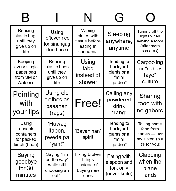 This bingo card has a free space and 24 words: “Huwag itapon, pwede pa ‘yan!”, Saying “I’m on the way” while still choosing an outfit, Using tabo instead of shower, Saying goodbye for 30 minutes, Turning off the lights when leaving a room (after mom screams), Reusing plastic bags until they give up on life, Keeping every single paper bag from SM or Watsons, Using leftover rice for sinangag (fried rice), Calling any powdered drink “Tang”, “Bayanihan” spirit, Tending to backyard plants or a “mini garden”, Pointing with your lips, Tending to backyard plants or a “mini garden”, Taking home food from parties — “for my sister” (but it’s for you), Reusing plastic bags until they give up on life, Eating with a spoon and fork only (never knife), Sharing food with neighbors, Wiping plates with tissue before eating in carinderia, Carpooling or “sabay tayo” culture, Using old clothes as basahan (rags), Clapping when the plane lands, Using reusable containers for packed lunch (baon), Sleeping anywhere, anytime and Fixing broken things instead of buying new ones.