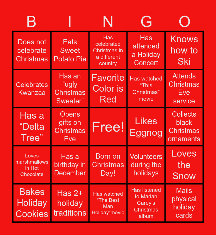 This bingo card has a free space and 24 words: Has a birthday in December, Has 2+ holiday traditions, Favorite Color is Red, Bakes Holiday Cookies, Knows how to Ski, Does not celebrate Christmas, Celebrates Kwanzaa, Eats Sweet Potato Pie, Likes Eggnog, Born on Christmas Day!, Has watched “This Christmas” movie, Has a “Delta Tree”, Volunteers during the holidays, Loves the Snow, Has an “ugly Christmas Sweater”, Has listened to Mariah Carey’s Christmas album, Collects black Christmas ornaments, Has celebrated Christmas in a different country, Attends Christmas Eve service, Opens gifts on Christmas Eve, Mails physical holiday cards, Loves marshmallows in Hot Chocolate, Has attended a Holiday Concert and Has watched “The Best Man Holiday”movie.