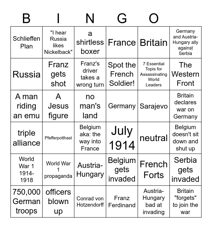 This bingo card has 36 words: Belgium gets invaded, Austria- Hungary, Franz Ferdinand, Russia, triple alliance, Germany, Franz gets shot, Conrad von Hotzendorff, Britain, French Forts, The Western Front, France, Serbia gets invaded, A Jesus figure, Spot the French Soldier!, Schlieffen Plan, World War 1 1914-1918, Sarajevo, A man riding an emu, a shirtless boxer, no man's land, Pfefferpotthast, July 1914, Belgium aka: the way into France, neutral, "I hear Russia likes Nickelback", 7 Essential Topis for Assassinating World Leaders, officers blown up, Franz's driver takes a wrong turn, Germany and Austria-Hungary ally against Serbia, Britain "forgets" to join the war, 750,000 German troops, Belgium doesn't sit down and shut up, Britain declares war on Germany, World War 1 propaganda and Austria-Hungary bad at invading.