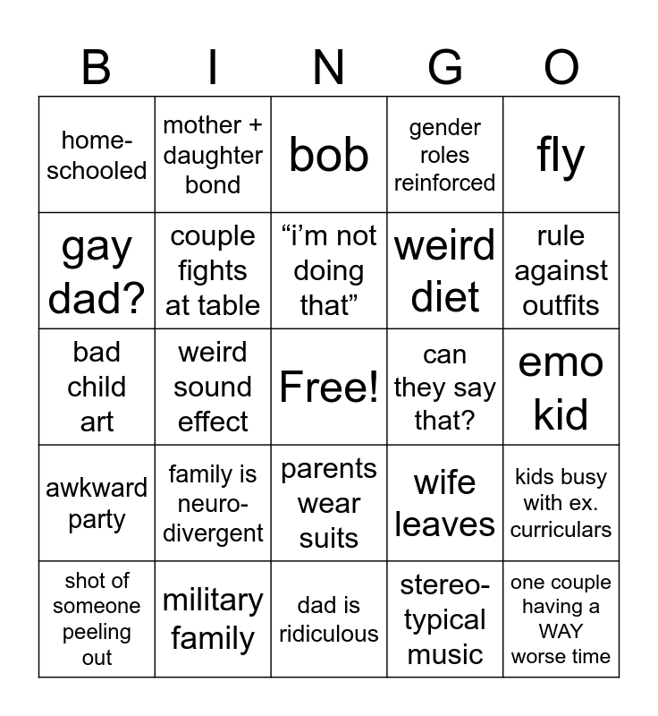 This bingo card has a free space and 50 words: dad cries first, one couple having a WAY worse time, kid curses, dad is ridiculous, family is neuro-divergent, dad refuses to clean, mother + daughter bond, obvious OCD, gay dad?, performs a song, couple fights at table, gender roles reinforced, kids busy with ex. curriculars, wife leaves, dirty toilet, crazy counter clutter, “i’m not doing that”, can they say that?, pet spotting, fly, weird sound effect, stereo-typical music, home-schooled, weird diet, body shaming, obvious favorite child, rule against outfits, dating restrictions, bob, parents wear suits, piñata moment, religious family, satanic atheist family, punk family, military family, “working mom”, vegetarian family, farmer family, poor hygiene, emo kid, ridiculous fashion, clean mom cleans, oldest kid cries, “she’s the devil”, shot of someone peeling out, bad child art, kids encouraged to destroy something, yelling in front of kids, awkward party and couple doesn’t hug at end.