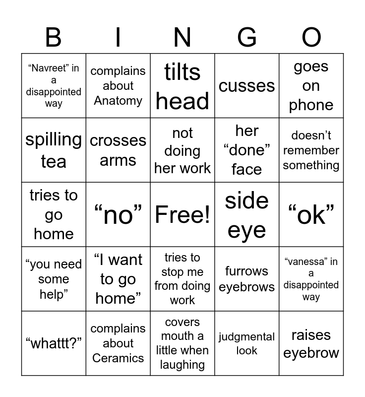 This bingo card has a free space and 24 words: “I want to go home”, complains about Ceramics, not doing her work, “whattt?”, goes on phone, “Navreet” in a disappointed way, spilling tea, complains about Anatomy, side eye, tries to stop me from doing work, her “done” face, tries to go home, furrows eyebrows, “vanessa” in a disappointed way, crosses arms, judgmental look, “ok”, tilts head, doesn’t remember something, “no”, raises eyebrow, “you need some help”, cusses and covers mouth a little when laughing.