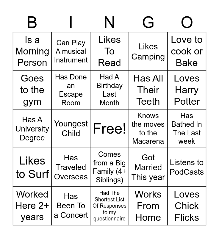 This bingo card has a free space and 24 words: Has Traveled Overseas, Has Been To a Concert, Had A Birthday Last Month, Worked Here 2+ years, Love to cook or Bake, Is a Morning Person, Goes to the gym, Can Play A musical Instrument, Knows the moves to the Macarena, Comes from a Big Family (4+ Siblings), Has All Their Teeth, Has A University Degree, Got Married This year, Listens to PodCasts, Has Done an Escape Room, Works From Home, Has Bathed In The Last week, Likes To Read, Loves Harry Potter, Youngest Child, Loves Chick Flicks, Likes to Surf, Likes Camping and Had The Shortest List Of Responses to my questionnaire.