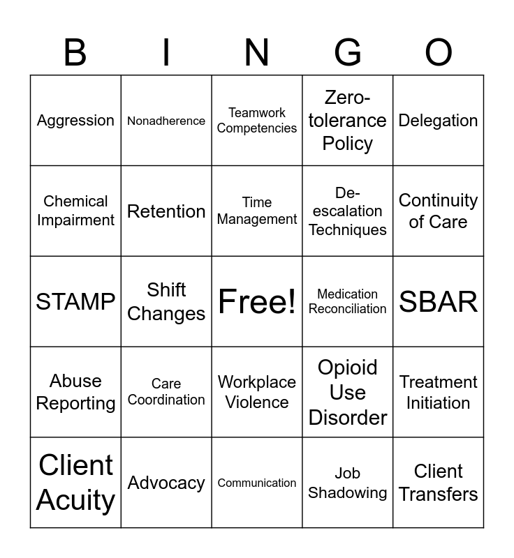 This bingo card has a free space and 25 words: Care Coordination, Communication, Time Management, Client Acuity, Delegation, Aggression, Chemical Impairment, Nonadherence, Medication Reconciliation, Workplace Violence, De-escalation Techniques, STAMP, Opioid Use Disorder, Treatment Initiation, Retention, Interprofessional Collaboration, SBAR, Teamwork Competencies, Continuity of Care, Shift Changes, Client Transfers, Advocacy, Abuse Reporting, Zero-tolerance Policy and Job Shadowing.