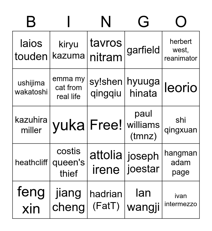 This bingo card has a free space and 24 words: costis queen's thief, jiang cheng, sy!shen qingqiu, feng xin, herbert west, reanimator, laios touden, ushijima wakatoshi, kiryu kazuma, paul williams (tmnz), attolia irene, hyuuga hinata, kazuhira miller, joseph joestar, hangman adam page, emma my cat from real life, lan wangji, shi qingxuan, tavros nitram, leorio, yuka, ivan intermezzo, heathcliff, garfield and hadrian (FatT).