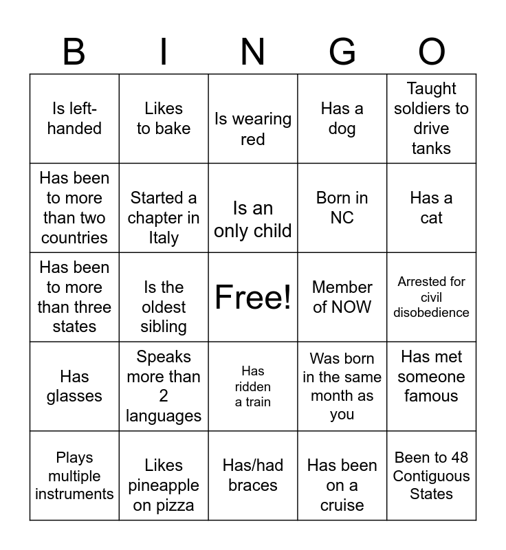 This bingo card has a free space and 24 words: Speaks more than 2 languages, Likes pineapple on pizza, Is an only child, Plays multiple instruments, Taught soldiers to drive tanks, Is left-handed, Has been to more than two countries, Likes to bake, Member of NOW, Has ridden a train, Born in NC, Has been to more than three states, Was born in the same month as you, Has met someone famous, Started a chapter in Italy, Has been on a cruise, Arrested for civil disobedience, Is wearing red, Has a cat, Is the oldest sibling, Been to 48 Contiguous States, Has glasses, Has a dog and Has/had braces.