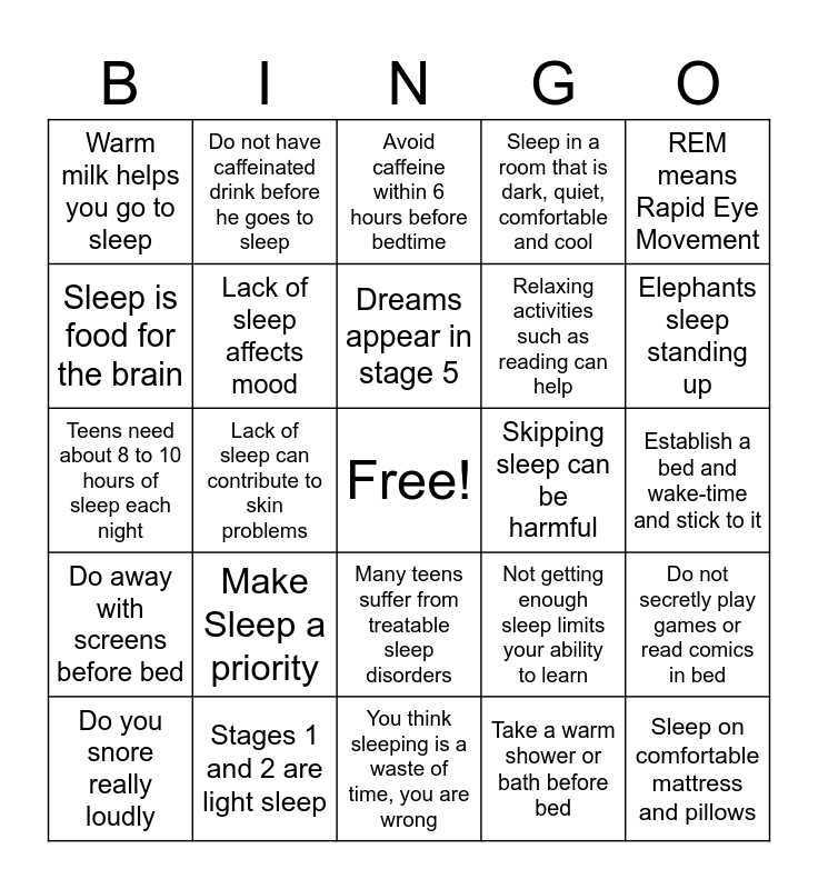 This bingo card has a free space and 24 words: Make Sleep a priority, Stages 1 and 2 are light sleep, Dreams appear in stage 5, Do you snore really loudly, REM means Rapid Eye Movement, Warm milk helps you go to sleep, Sleep is food for the brain, Do not have caffeinated drink before he goes to sleep, Skipping sleep can be harmful, Many teens suffer from treatable sleep disorders, Relaxing activities such as reading can help, Teens need about 8 to 10 hours of sleep each night, Not getting enough sleep limits your ability to learn, Do not secretly play games or read comics in bed, Lack of sleep affects mood, Take a warm shower or bath before bed, Establish a bed and wake-time and stick to it, Avoid caffeine within 6 hours before bedtime, Elephants sleep standing up, Lack of sleep can contribute to skin problems, Sleep on comfortable mattress and pillows, Do away with screens before bed, Sleep in a room that is dark, quiet, comfortable and cool and You think sleeping is a waste of time, you are wrong.