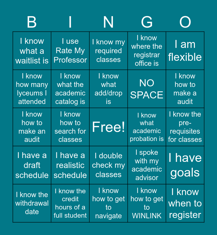 This bingo card has a free space and 31 words: I know how to get to navigate, I'm on track to graduate for my timeline, I know how to search for classes, I know what "multiple meeting times" means, I know what a waitlist is, I know my required classes, I know what the academic catalog is, I spoke with my academic advisor, I know what academic probation is, I know how to get to WINLINK, I know the pre-requisites for classes, I know when to register, I have no student account hold, I will be up in time to register, I know how to make a audit, I know where to find the school Calendar, I have goals, I have a realistic schedule, I have a draft schedule, I double check my classes, I am flexible, I ask about classes, I know the withdrawal date, I use Rate My Professor, NO SPACE, I know how many lyceums I attended, I know where the registrar office is, I know how to make an audit, I know the credit hours of a full student, I know what add/drop is and I ask questions.