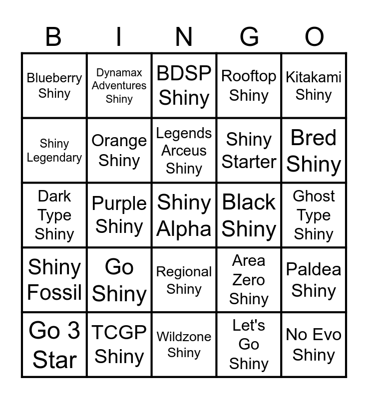 This bingo card has a free space and 24 words: Go 3 Star, Go Shiny, Legends Arceus Shiny, Let's Go Shiny, Kitakami Shiny, Blueberry Shiny, Dynamax Adventures Shiny, BDSP Shiny, Black Shiny, Ghost Type Shiny, Dark Type Shiny, Orange Shiny, Area Zero Shiny, Paldea Shiny, Shiny Legendary, TCGP Shiny, Wildzone Shiny, Rooftop Shiny, Bred Shiny, Shiny Fossil, Purple Shiny, Regional Shiny, Shiny Starter and No Evo Shiny.