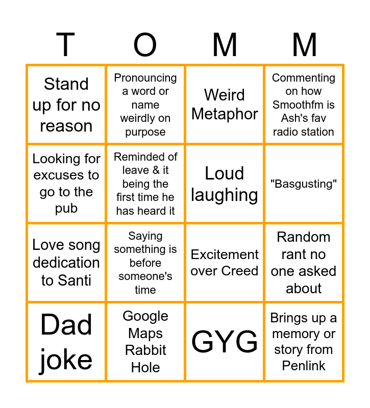 This bingo card has 16 words: Google Maps Rabbit Hole, Random rant no one asked about, Weird Metaphor, Stand up for no reason, Love song dedication to Santi, Pronouncing a word or name weirdly on purpose, Excitement over Creed, GYG, Looking for excuses to go to the pub, Reminded of leave & it being the first time he has heard it, Dad joke, Commenting on how Smoothfm is Ash's fav radio station, Saying something is before someone's time, "Basgusting", Loud laughing and Brings up a memory or story from Penlink.