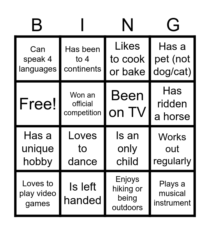 This bingo card has 16 words: Is left handed, Works out regularly, Likes to cook or bake, Can speak 4 languages, Has a unique hobby, Has been to 4 continents, Is an only child, Enjoys hiking or being outdoors, Free!, Won an official competition, Loves to play video games, Has a pet (not dog/cat), Loves to dance, Has ridden a horse, Been on TV and Plays a musical instrument.