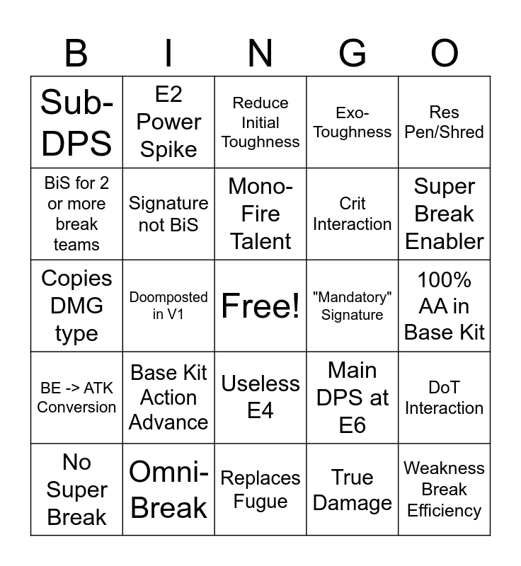 This bingo card has a free space and 49 words: Double Break, Weakness Break Efficiency, Replaces Ruan Mei, Replaces Fugue, Base Kit Action Advance, Action Advance Eidolon, E2 Power Spike, Healing/Shielding, BiS for 2 or more break teams, BiS for 1 or 0 teams, Signature not BiS, Exo-Toughness, DoT Interaction, Main DPS at E6, SP Negative, SP Positive, Mono-Fire Talent, "Mandatory" Signature, Global Passive, Res Pen/Shred, Doomposted in V1, True Damage, Sub-DPS, Crit Interaction, Percentage Toughness Damage, Super Break Enabler, No Super Break, Useless Trace Stat, Useless E4, BE -> ATK Conversion, Teamwide SPD Buff, Only Single Target Buffs/Debuffs, AoE Buffs/Debuffs, Weakness Implant, Omni-Break, BE Scaling BE Buff, Normal Break Damage Buffs, Faster Break Recovery, 100% AA in Base Kit, Elation Interaction, Acheron Support, FuA, No Offensive Abilities, Band-Aid Eidolons, Copies DMG type, Reduce Initial Toughness, Damage outside Break Teams, Doesn't Need EHR and Condition-less super break.