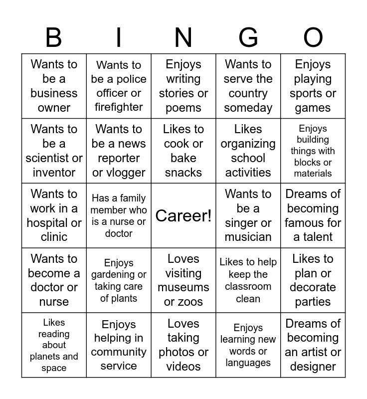 This bingo card has a free space and 60 words: Loves to draw or color pictures, Enjoys helping classmates or friends, Wants to be a teacher someday, Has a family member who is a nurse or doctor, Likes to read books or stories, Enjoys solving puzzles or riddles, Likes to cook or bake snacks, Loves animals and wants to care for them, Wants to be a police officer or firefighter, Enjoys using computers or tablets, Wants to be a scientist or inventor, Likes to sing or dance, Enjoys building things with blocks or materials, Wants to be a pilot or flight attendant, Likes to travel to new places, Wants to be a business owner, Loves taking photos or videos, Enjoys playing sports or games, Wants to be a lawyer or judge someday, Likes organizing school activities, Wants to work in a hospital or clinic, Enjoys writing stories or poems, Dreams of becoming an artist or designer, Enjoys gardening or taking care of plants, Wants to be a fashion designer or model, Likes to invent or create new things, Enjoys helping classmates with lessons, Loves to watch science or nature shows, Wants to be a news reporter or vlogger, Enjoys counting money or solving math problems, Wants to be a game developer someday, Loves to draw comics or cartoon characters, Wants to protect the environment, Enjoys teamwork during group activities, Wants to serve the country someday, Likes reading about planets and space, Enjoys taking care of younger kids, Dreams of becoming famous for a talent, Likes to collect and organize things, Wants to be a singer or musician, Enjoys acting in role plays or skits, Loves visiting museums or zoos, Likes to plan or decorate parties, Wants to be a chef or baker, Enjoys learning new words or languages, Likes to repair broken things, Loves to play instruments, Wants to be an engineer or architect, Enjoys drawing maps or flags of countries, Likes to help keep the classroom clean, Wants to become a doctor or nurse, Enjoys making crafts or DIY projects, Likes to care for pets or stray animals, Wants to work at a school someday, Loves playing educational games, Enjoys helping with household chores, Wants to be a YouTuber or content creator, Likes learning about history and culture, Enjoys helping in community service and Wants to be a leader or class officer.