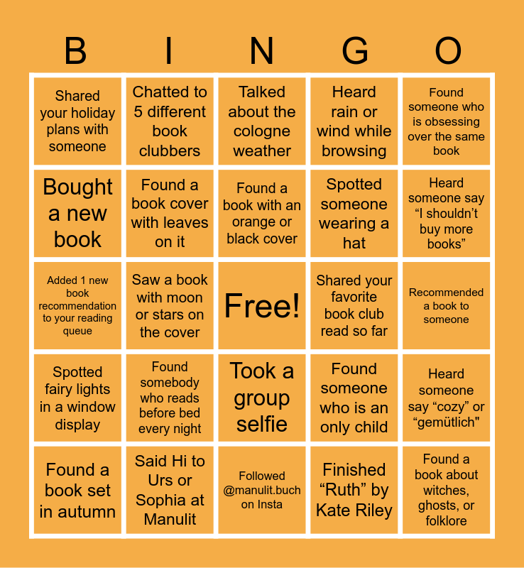 This bingo card has a free space and 24 words: Found somebody who reads before bed every night, Said Hi to Urs or Sophia at Manulit, Found a book with an orange or black cover, Found a book set in autumn, Found someone who is obsessing over the same book, Shared your holiday plans with someone, Bought a new book, Chatted to 5 different book clubbers, Shared your favorite book club read so far, Took a group selfie, Spotted someone wearing a hat, Added 1 new book recommendation to your reading queue, Found someone who is an only child, Heard someone say “cozy” or “gemütlich", Found a book cover with leaves on it, Finished “Ruth” by Kate Riley, Recommended a book to someone, Talked about the cologne weather, Heard someone say “I shouldn’t buy more books”, Saw a book with moon or stars on the cover, Found a book about witches, ghosts, or folklore, Spotted fairy lights in a window display, Heard rain or wind while browsing and Followed @manulit.buch on Insta.