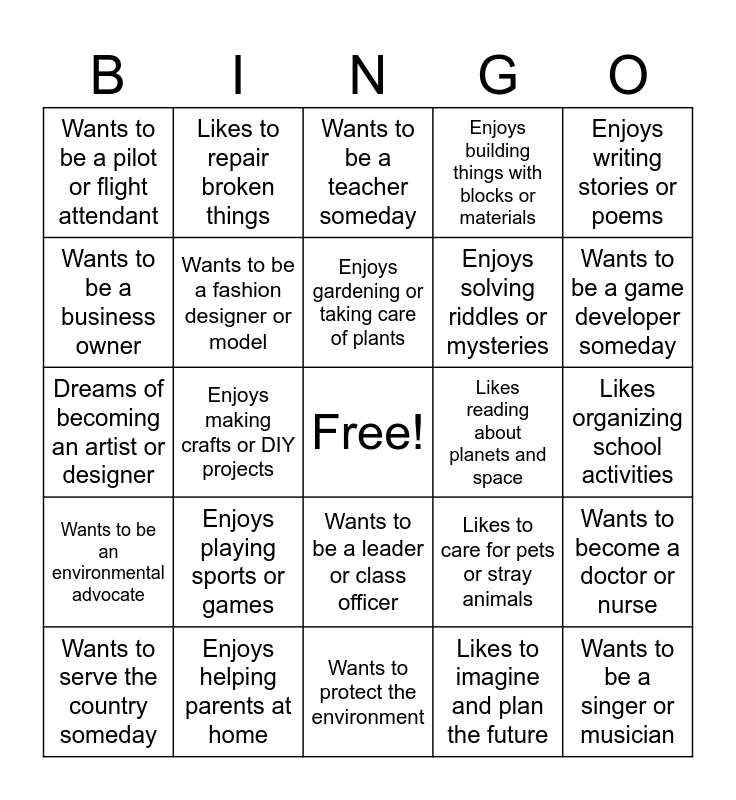 This bingo card has a free space and 80 words: Loves to draw or color pictures, Enjoys helping classmates or friends, Wants to be a teacher someday, Has a family member who is a nurse or doctor, Likes to read books or stories, Enjoys solving puzzles or riddles, Likes to cook or bake snacks, Loves animals and wants to care for them, Wants to be a police officer or firefighter, Enjoys using computers or tablets, Wants to be a scientist or inventor, Likes to sing or dance, Enjoys building things with blocks or materials, Wants to be a pilot or flight attendant, Likes to travel to new places, Wants to be a business owner, Loves taking photos or videos, Enjoys playing sports or games, Wants to be a lawyer or judge someday, Likes organizing school activities, Wants to work in a hospital or clinic, Enjoys writing stories or poems, Dreams of becoming an artist or designer, Enjoys gardening or taking care of plants, Wants to be a fashion designer or model, Likes to invent or create new things, Enjoys helping classmates with lessons, Loves to watch science or nature shows, Wants to be a news reporter or vlogger, Enjoys counting money or solving math problems, Wants to be a game developer someday, Loves to draw comics or cartoon characters, Wants to protect the environment, Enjoys teamwork during group activities, Wants to serve the country someday, Likes reading about planets and space, Enjoys taking care of younger kids, Dreams of becoming famous for a talent, Likes to collect and organize things, Wants to be a singer or musician, Enjoys acting in role plays or skits, Loves visiting museums or zoos, Likes to plan or decorate parties, Wants to be a chef or baker, Enjoys learning new words or languages, Likes to repair broken things, Loves to play instruments, Wants to be an engineer or architect, Enjoys drawing maps or flags of countries, Likes to help keep the classroom clean, Wants to become a doctor or nurse, Enjoys making crafts or DIY projects, Likes to care for pets or stray animals, Wants to work at a school someday, Loves playing educational games, Enjoys helping with household chores, Wants to be a YouTuber or content creator, Likes learning about history and culture, Enjoys helping in community service, Wants to be a leader or class officer, Enjoys solving riddles or mysteries, Likes to design posters or cards, Wants to be a computer programmer, Enjoys watching career-related videos, Likes to draw on digital tablets, Enjoys performing in front of an audience, Wants to be a photographer, Likes to share ideas during discussions, Enjoys writing in a journal or diary, Loves to play or compose music, Wants to be an environmental advocate, Enjoys helping parents at home, Likes to help decorate the classroom, Loves learning about new inventions, Wants to be a counselor or psychologist, Enjoys making PowerPoint or digital slides, Likes to imagine and plan the future, Loves learning about famous people and careers, Wants to be part of a community organization and Enjoys discovering new talents and hobbies.