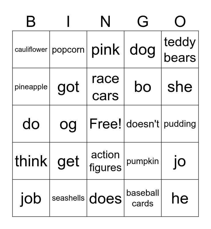 This bingo card has a free space and 26 words: action figures, baseball cards, race cars, seashells, teddy bears, cauliflower, pineapple, popcorn, pudding, pumpkin, bo, do, jo, job, og, log, dog, think, pink, he, she, does, doesn't, get, got and many.