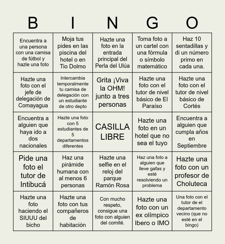 This bingo card has a free space and 24 words: Haz una pirámide humana con al menos 6 personas, Hazte una foto con tus compañeros de habitación, Grita ¡Viva la OHM! junto a tres personas, Hazte una foto haciendo el SIUUU del bicho, Haz 10 sentadillas y di un número primo en cada una., Encuentra a una persona con una camisa de fútbol y hazle una foto, Hazte una foto con el jefe de delegación de Comayagua, Moja tus pides en las piscina del hotel o en Tio Dolmo, Hazte una foto en un hotel que no sea el tuyo, Hazte una selfie en el reloj del parque Ramón Rosa, Hazte una foto con el tutor de nivel básico de El Paraíso, Encuentra a alguien que haya ido a dos nacionales, Haz una foto a alguien que lleve gafas y esté resolviendo un problema, Hazte una foto con un profesor de Choluteca, Intercambia temporalmente tu camisa de delegación con un estudiante de otro depto, Hazte una foto con un ex olímpico Ibero o IMO, Encuentra a alguien que cumpla años en Septiembre, Hazte una foto en la entrada principal del Perla del Ulúa, Hazte una foto con el tutor de nivel básico de Cortés, Hazte una foto con 5 estudiantes de 5 departamentos diferentes, Una foto con el tutor de el departamento vecino (que no esté en el bingo), Pide una foto el tutor de Intibucá, Toma foto a un cartel con una fórmula o símbolo matemático and Con mucho respeto, consigue una foto con alguien del comité..