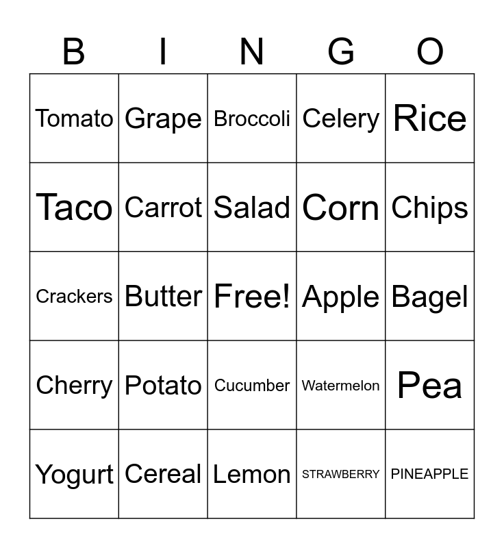 This bingo card has a free space and 67 words: APPLE, BANANA, GRAPES, STRAWBERRY, PINEAPPLE, Orange, Grape, Strawberry, Watermelon, Mango, Cherry, Blueberry, Lemon, Apple, Banana, Carrot, Broccoli, Celery, Lettuce, Tomato, Potato, Cucumber, Corn, Pea, Onion, Pizza, Hot dog, Burger, Taco, Spaghetti, Salad, Sandwich, Soup, Pancakes, Cereal, Milk, Cheese, Yogurt, Butter, Ice cream, Cookie, Chips, Crackers, Cake, Donut, Popcorn, Pretzel, Candy, Brownie, Fries, Rice, Bread, Pasta, Oatmeal, Toast, Bagel, Muffin, Quinoa, Ketchup, Mustard, Mayonnaise, Relish, Pickle, Jam, Honey, Salt and Pepper.