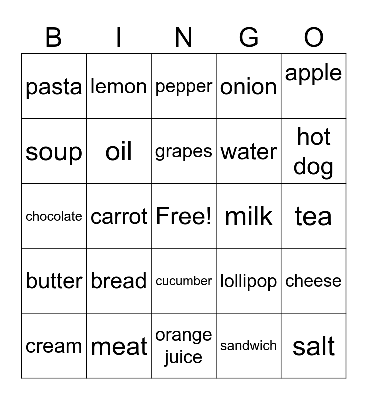 This bingo card has a free space and 24 words: bread, meat, grapes, cream, apple, pasta, soup, lemon, milk, cucumber, water, chocolate, lollipop, cheese, oil, sandwich, tea, pepper, hot dog, carrot, salt, butter, onion and orange juice.