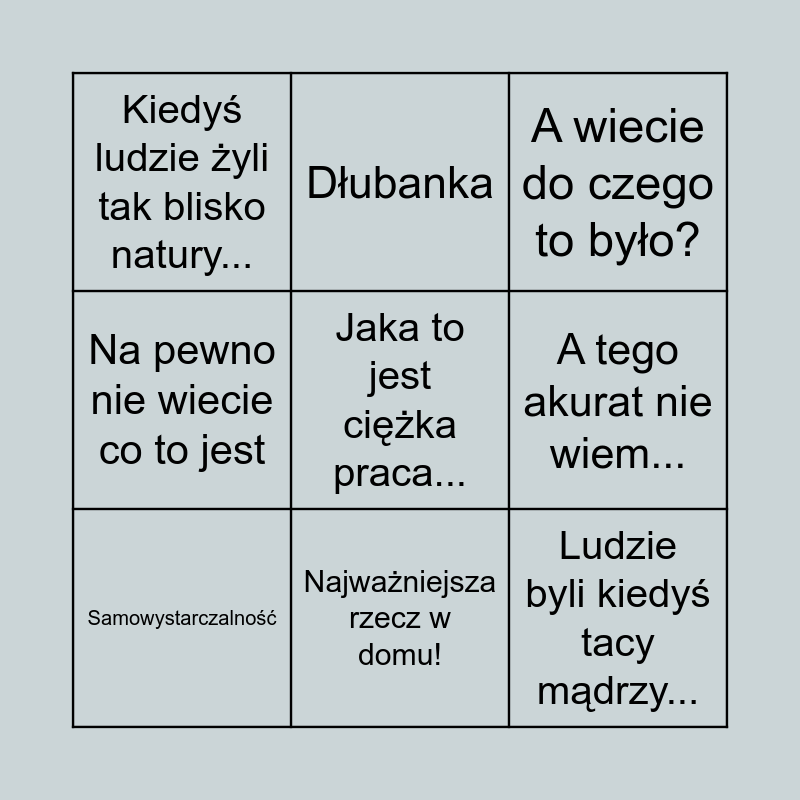 This bingo card has 9 words: Samowystarczalność, Jaka to jest ciężka praca..., A wiecie do czego to było?, Kiedyś ludzie żyli tak blisko natury..., Dłubanka, A tego akurat nie wiem..., Na pewno nie wiecie co to jest, Najważniejsza rzecz w domu! and Ludzie byli kiedyś tacy mądrzy....
