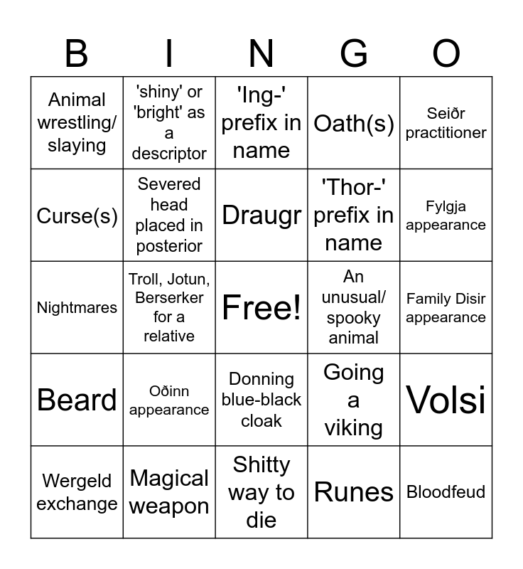 This bingo card has a free space and 24 words: Oðinn appearance, Magical weapon, Draugr, Wergeld exchange, Seiðr practitioner, Animal wrestling/ slaying, Curse(s), 'shiny' or 'bright' as a descriptor, An unusual/ spooky animal, Donning blue-black cloak, 'Thor-' prefix in name, Nightmares, Going a viking, Volsi, Severed head placed in posterior, Runes, Family Disir appearance, 'Ing-' prefix in name, Fylgja appearance, Troll, Jotun, Berserker for a relative, Bloodfeud, Beard, Oath(s) and Shitty way to die.