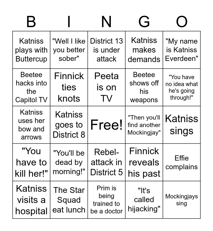 This bingo card has a free space and 32 words: "It's called hijacking", "If we burn, you burn with us!", Katniss goes to District 8, Katniss finds a rose, "You have to kill her!", Finnick ties knots, "My name is Katniss Everdeen", Effie complains, "Well I like you better sober", "And that, my friends, is how a revolution dies", Peeta is on TV, District 13 is under attack, Peeta thrashes around, Coin gives a speech, "Then you'll find another Mockingjay", Katniss and Gale go hunting, Katniss visits a hospital, Katniss uses her bow and arrows, Rebel-attack in District 5, "You'll be dead by morning!", Finnick reveals his past, District 13 attacks the Capitol, Katniss sings, The Star Squad eat lunch, Mockingjays sing, Katniss makes demands, Beetee shows off his weapons, Beetee hacks into the Capitol TV, Katniss plays with Buttercup, Prim is being trained to be a doctor, "I saw a coward" and "You have no idea what he's going through!".
