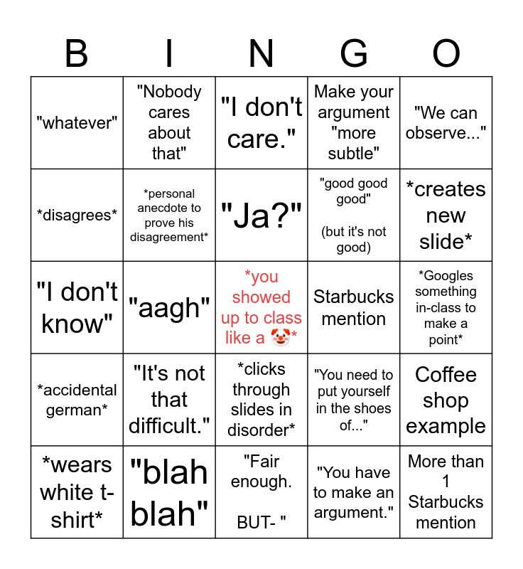 This bingo card has a free space and 24 words: "It's not that difficult.", "blah blah", "Ja?", *wears white t-shirt*, "We can observe...", "whatever", *disagrees*, "Nobody cares about that", Starbucks mention, *clicks through slides in disorder*, "good good good" (but it's not good), "I don't know", "You need to put yourself in the shoes of...", Coffee shop example, *personal anecdote to prove his disagreement*, "You have to make an argument.", *Googles something in-class to make a point*, "I don't care.", *creates new slide*, "aagh", More than 1 Starbucks mention, *accidental german*, Make your argument "more subtle" and "Fair enough. BUT- ".