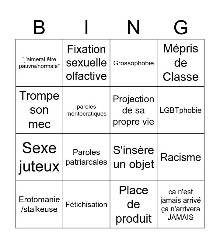 This bingo card has 16 words: Fétichisation, Racisme, Grossophobie, "j'aimerai être pauvre/normale", Sexe juteux, Fixation sexuelle olfactive, S'insère un objet, Place de produit, Trompe son mec, paroles méritocratiques, Erotomanie /stalkeuse, Mépris de Classe, Paroles patriarcales, LGBTphobie, Projection de sa propre vie and ca n'est jamais arrivé ça n'arrivera JAMAIS.