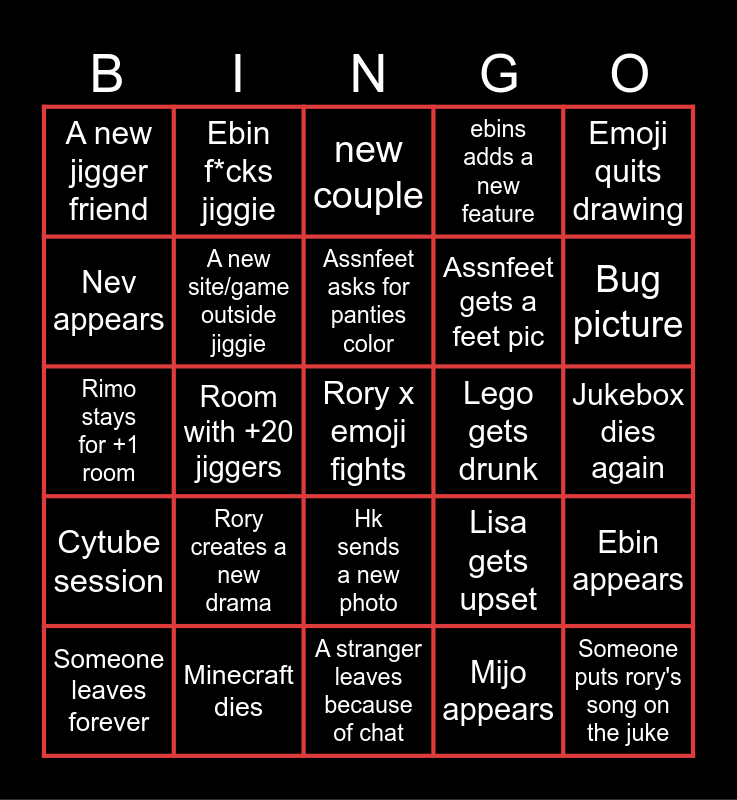 This bingo card has a free space and 24 words: Rory creates a new drama, Minecraft dies, Assnfeet asks for panties color, Someone leaves forever, Emoji quits drawing, A new jigger friend, Nev appears, Ebin f*cks jiggie, Lego gets drunk, Hk sends a new photo, Assnfeet gets a feet pic, Rimo stays for +1 room, Lisa gets upset, Ebin appears, A new site/game outside jiggie, Mijo appears, Jukebox dies again, new couple, Bug picture, Room with +20 jiggers, Someone puts rory's song on the juke, Cytube session, ebins adds a new feature and A stranger leaves because of chat.