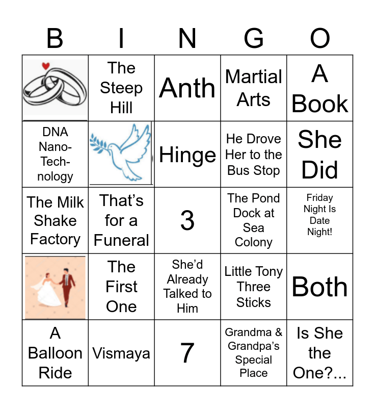 This bingo card has 3 images and 32 words: Mumbai, A Red Corvette, A Minivan, She’d Already Talked to Him, Martial Arts, DNA Nano-Tech-nology, Indian, Hinge, Brother Mike, The Milk Shake Factory, A Book, The Hindu Priesthood, Red, Green, & Gold, The Pond Dock at Sea Colony, Grandma & Grandpa’s Special Place, That’s for a Funeral, 3, Little Tony Three Sticks, A Balloon Ride, Both, Vismaya, Anth, She Did, Is She the One?..., A Break Up & A Comment, He Drove Her to the Bus Stop, Friday Night Is Date Night!, The Sewer Line Collapsed, 7, The First One, The Steep Hill and FREE SPACE.