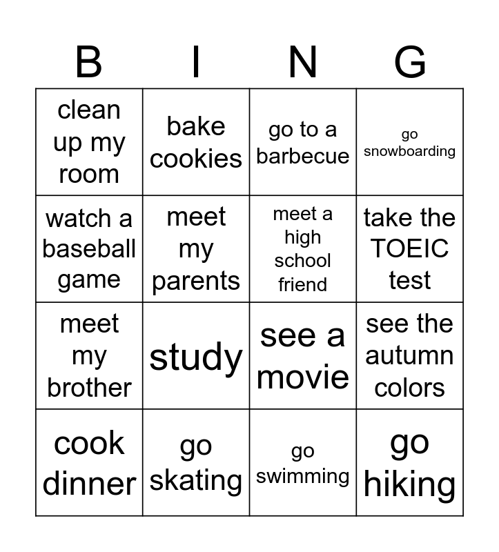 This bingo card has 43 words: Free!, cook dinner, play video games, hang out with friends, go to karaoke, go out for drinks, go to a barbecue, play soccer, watch a baseball game, go skiing, go snowboarding, go skating, go out for ramen, go out for suchi, go to a classical music concert, go to a concert, see a musical, see a movie, stay home, study, bake cookies, bake a cake, do laundry, clean up my room, go to a hotspring, go swimming, work, work out, play Mine Craft, go hiking, go camping, go for a drive, go fishing, see the autumn colors, eat yakiniku, study English, take an EIKEN test, take the TOEIC test, meet my parents, meet my brother, meet my sister, meet a high school friend and meet s friend from my hometown.