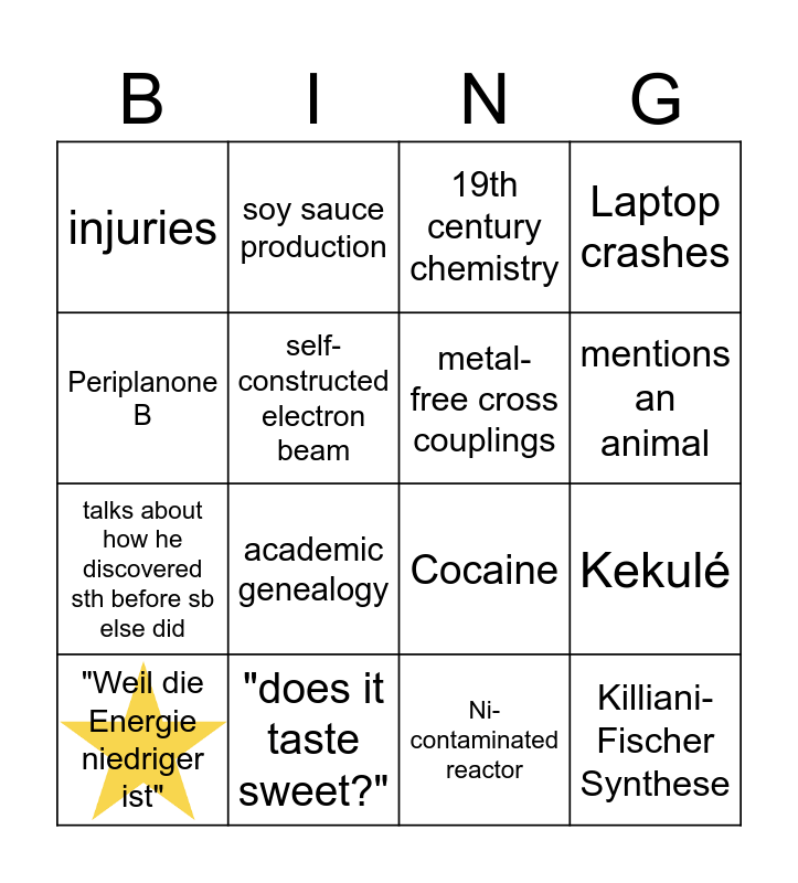 This bingo card has 1 images and 19 words: Cocaine, story about his car, 19th century chemistry, Killiani-Fischer Synthese, Kekulé, Periplanone B, Ni-contaminated reactor, injuries, soy sauce production, talks about how he discovered sth before sb else did, academic genealogy, self-constructed electron beam, metal-free cross couplings, "does it taste sweet?", "Weil die Energie niedriger ist", Chen arrives with this Wägeli, Laptop crashes, mentions an animal and shows a fancy molecule.