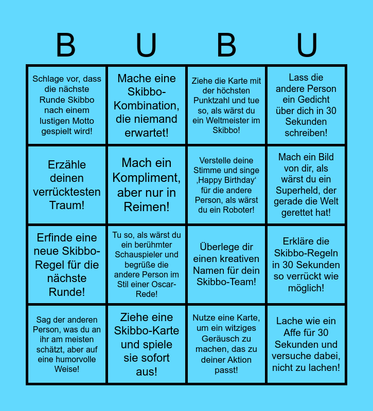 This bingo card has 16 words: Ziehe eine Skibbo-Karte und spiele sie sofort aus!, Erkläre die Skibbo-Regeln in 30 Sekunden so verrückt wie möglich!, Ziehe die Karte mit der höchsten Punktzahl und tue so, als wärst du ein Weltmeister im Skibbo!, Schlage vor, dass die nächste Runde Skibbo nach einem lustigen Motto gespielt wird!, Erfinde eine neue Skibbo-Regel für die nächste Runde!, Mache eine Skibbo-Kombination, die niemand erwartet!, Überlege dir einen kreativen Namen für dein Skibbo-Team!, Nutze eine Karte, um ein witziges Geräusch zu machen, das zu deiner Aktion passt!, Erzähle deinen verrücktesten Traum!, Mach ein Kompliment, aber nur in Reimen!, Sag der anderen Person, was du an ihr am meisten schätzt, aber auf eine humorvolle Weise!, Lass die andere Person ein Gedicht über dich in 30 Sekunden schreiben!, Tu so, als wärst du ein berühmter Schauspieler und begrüße die andere Person im Stil einer Oscar-Rede!, Mach ein Bild von dir, als wärst du ein Superheld, der gerade die Welt gerettet hat!, Verstelle deine Stimme und singe ‚Happy Birthday‘ für die andere Person, als wärst du ein Roboter! and Lache wie ein Affe für 30 Sekunden und versuche dabei, nicht zu lachen!.