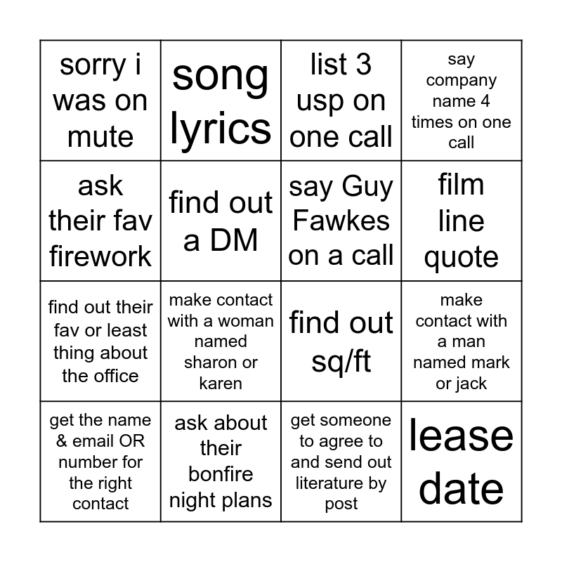 This bingo card has 16 words: ask about their bonfire night plans, make contact with a man named mark or jack, list 3 usp on one call, sorry i was on mute, find out their fav or least thing about the office, song lyrics, find out sq/ft, get someone to agree to and send out literature by post, ask their fav firework, find out a DM, get the name & email OR number for the right contact, say company name 4 times on one call, make contact with a woman named sharon or karen, film line quote, say Guy Fawkes on a call and lease date.