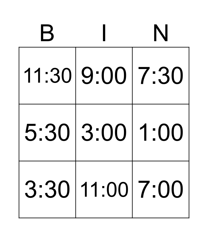This bingo card has a free space and 8 words: 1:00, 7:30, 9:00, 3:30, 11:30, 7:00, 5:30 and 11:00.