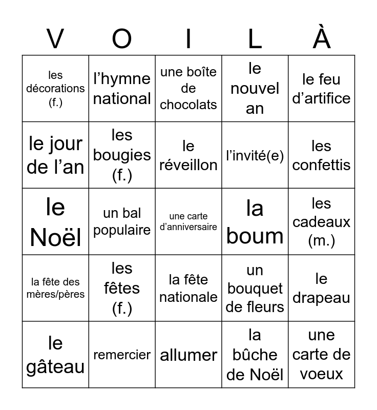 This bingo card has 31 words: allumer, l’anniversaire, un bal populaire, le ballon, les décorations (f.), une boîte de chocolats, les bougies (f.), un bouquet de fleurs, la boum, la bûche de Noël, les cadeaux (m.), une carte d’anniversaire, une carte de voeux, un chèque-cadeau, les confettis, le défilé, le drapeau, les fêtes (f.), la fête des mères/pères, la fête nationale, le feu d’artifice, la foule, le gâteau, l’hymne national, l’invité(e), le jour de l’an, le nouvel an, le Noël, remercier, le réveillon and le sapin de Noël.