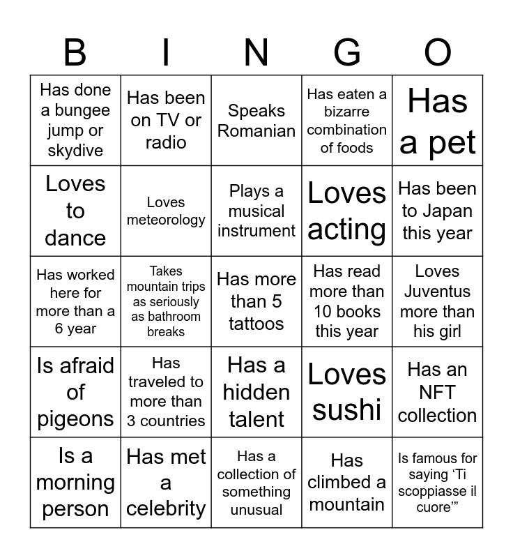 This bingo card has a free space and 24 words: Has traveled to more than 3 countries, Has met a celebrity, Plays a musical instrument, Is a morning person, Has a pet, Has done a bungee jump or skydive, Loves to dance, Has been on TV or radio, Has read more than 10 books this year, Has a hidden talent, Loves acting, Has worked here for more than a 6 year, Loves sushi, Has an NFT collection, Loves meteorology, Has climbed a mountain, Loves Juventus more than his girl, Speaks Romanian, Has been to Japan this year, Takes mountain trips as seriously as bathroom breaks, Is famous for saying ‘Ti scoppiasse il cuore’”, Is afraid of pigeons, Has eaten a bizarre combination of foods and Has a collection of something unusual.